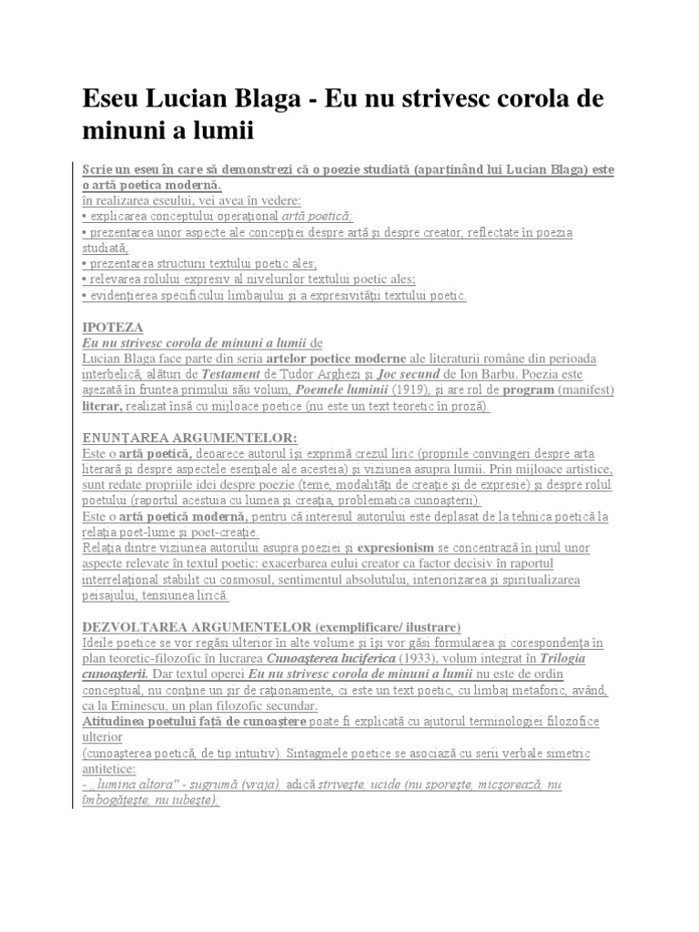 Eseu Lucian Blaga Eu Nu Strivesc Corola De Minuni A Lumii