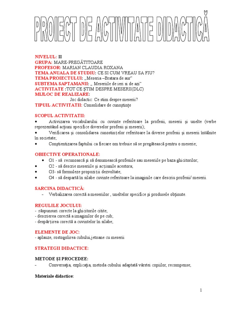 Proiect Tematic Meseria Bratara De Aur 2014 Docx