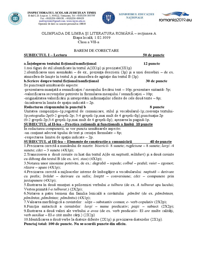 Subiect Olimpiada De Limba și Literatura Romană