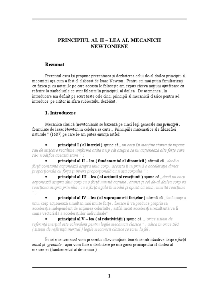 Referat Principiul Al Doilea Al Mecanicii Newtoniene