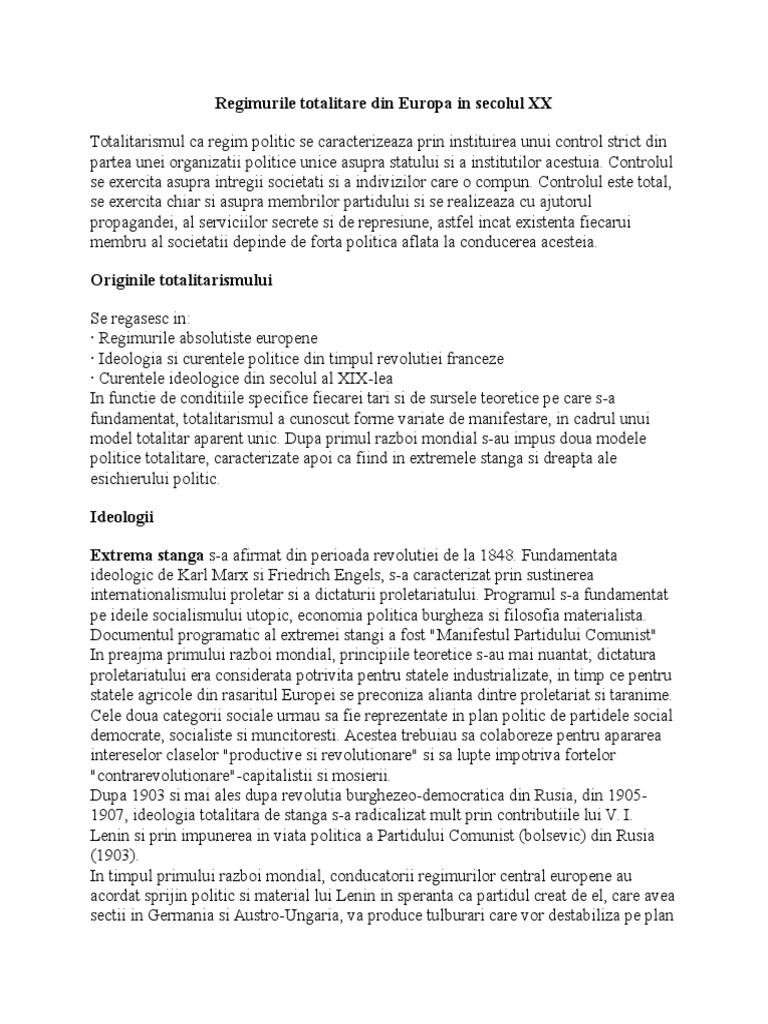 Regimurile Totalitare Din Europa In Secolul Xx