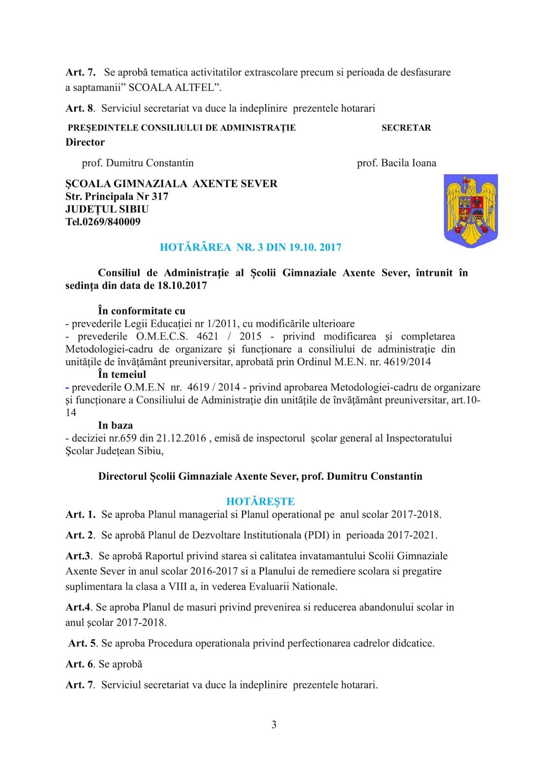 Scoala Gimnaziala Axente Sever Hotarari Ale Consiliului De Administratie In Anul Scolar 2017 2018