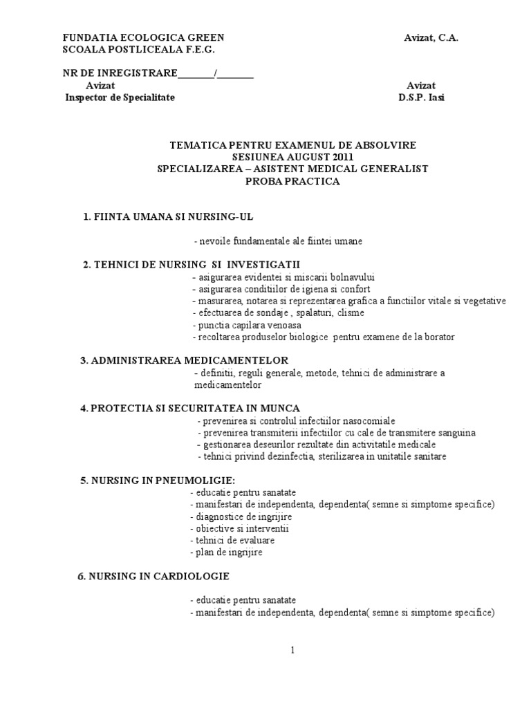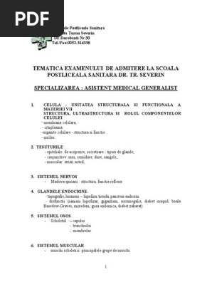 Tematica Examenului De Admitere La Scoala Postliceala Sanitara Dr Tr Severin Specializarea Asistent Medical Generalist
