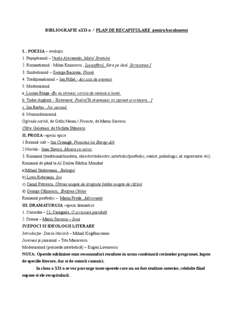 76153175 Bibliografie Xii Plan Recapitulare Bacalaureat Romana Doc