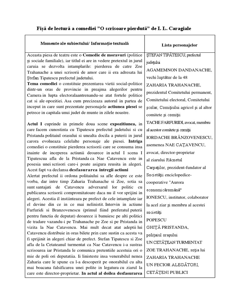Fișă De Lectură A Comediei O Scrisoare Pierdută De I L Caragiale