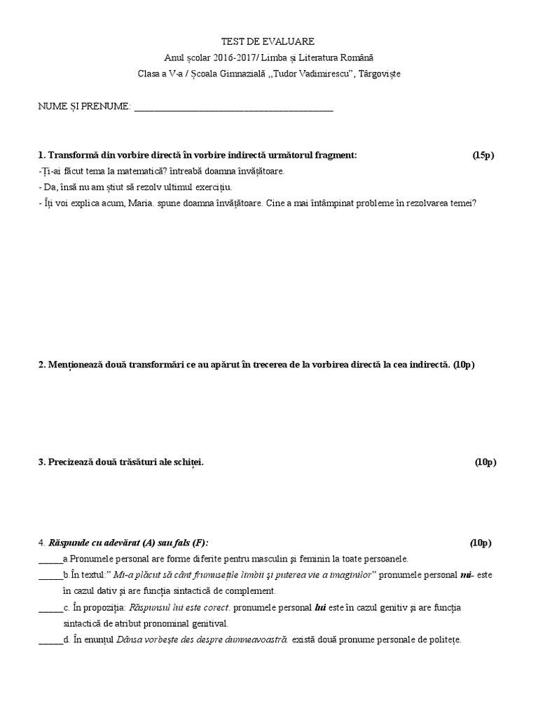 Teza Limba Romana Clasa A 8 A Sem I